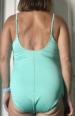 Love the color of this swimsuit, the style is basic but classic. Adjustable straps and padded. It doesn’t tuck in the tummy area though as it is pretty soft fabric. The style and ribbed fabric gave it a sporty look as well as its lower cut back. Good bottom coverage and not too low of a neckline so it’s good for conservative girlies.