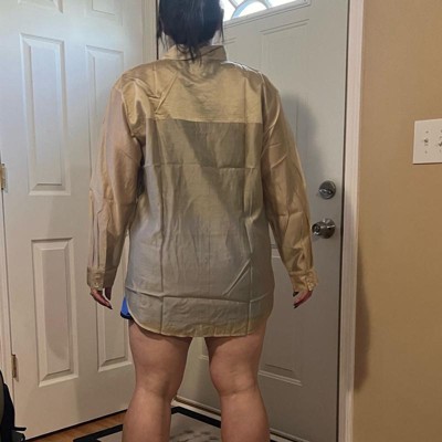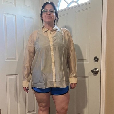 [This review was collected as part of a promotion.] This long sleeve cuffed button up sheer women’s collared shirt Is in a beautiful creamy gold color. It is extremely comfortable and not scratchy at all on your skin like you might think with this type of fabric it would pair well with a tube top or a tank top underneath it. I am typically a size 14 order this in a size extra large it fit me perfectly with room for layering. I could see this dressed up with some black slacks or down into some jeans. I received an incentive to write this review.