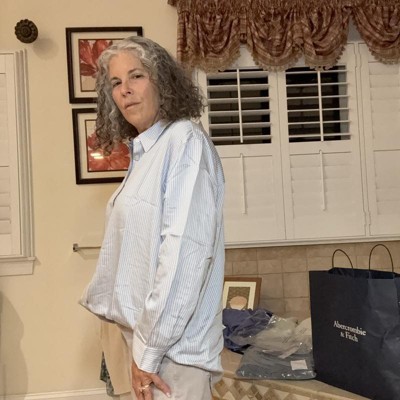 [This review was collected as part of a promotion.] This shirt is a size extra large and is blue and white striped. The sleeves are long and at the cuff there are two buttons. The collar does not have buttons. There are no pockets on this shirt. This shirt buttons closed with eight buttons. There is no extra button provided. This shirt is very soft and comfortable and somewhat oversized. This shirt would look great with a pair of jeans, shorts or with a skirt. It could even be worn instead of a sweater with a dress or any outfit. I received an incentive to write this review.