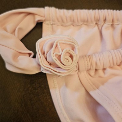 [This review was collected as part of a promotion.] I love this light pink bikini bottom. It has a thick roll style waist band. The sides kind of open up making it not too tight on your love handles. Which I love! There is a small pink rosette on the bottoms that is detachable and moved onto the other side if you want it to. This is a size large bottom or a 12-14 and it fits very true to size. The bathing suit also had full coverage on the backside! I received an incentive to write this review.