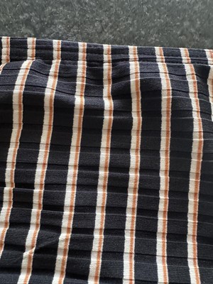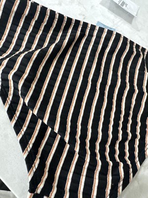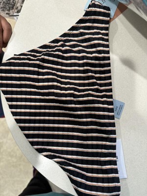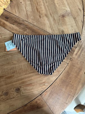 Ribbed cheeky bikini bottom. Has more coverage than the average bikini bottom. Black, orange and white vertical stripes. Cute with a solid top or matching bikini top. I ordered a large I’m a size 8 and it is a little bigger. Possibly size down.