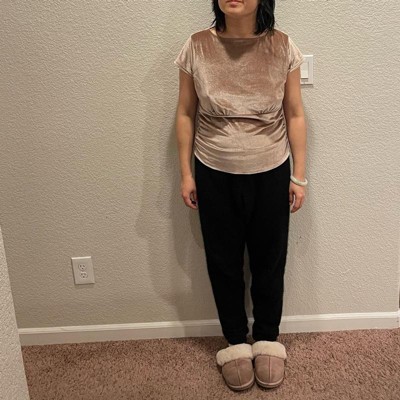 [This review was collected as part of a promotion.] I am five feet tall, have a bra size of 34 DD, and tried on the size medium in this ruched velour shirt from A New Day. This shirt is super comfortable! I love the material and the way it sits on my body. The fit is very nice- I would definitely say it fits true to size. I think this is a very versatile top that could go with many bottoms.
