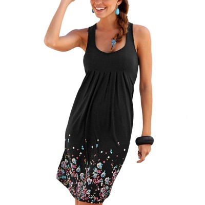 [This review was collected as part of a promotion.] I really Love this mini a line seemed flare dress it has pockets and thicker straps at the top. It is a black with a really pretty cream tan floral print. I’m typically a size 12 to a 14 and I purchased this in a size 16 as I wanted it to not be too tight I have a thicker section so sometimes I have an issue with that