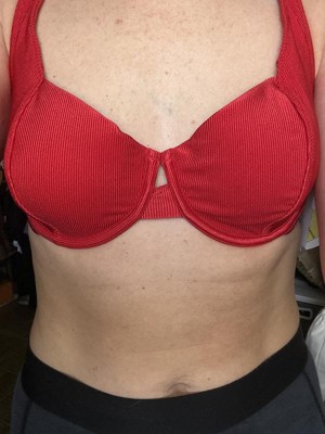 The Women's Shiny Ribbed Underwire Bikini Top by Wild Fable is a beautiful swimsuit top. I have a large chest DD and the size large in this top is small. I would suggest this top for a large C-D cup chest. Aside from that it is well made and a pretty shiny red color. I would recommend.