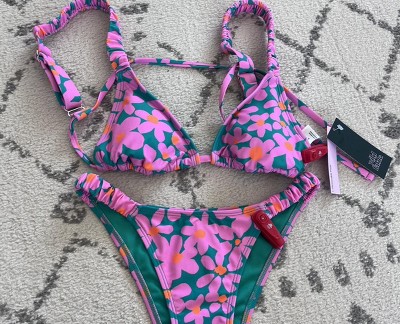 This fit is soooo flattering (possibly my favorite swimsuit fit ever!!!) but I returned it because the colors were too much on me. The pink, orange and green seemed to clash, I have tan skin and am not sure if that’s why. But the fit is so flattering. I’m 110 lbs, 5 ft 1, 34A and I got a size small top and x-small bottoms. The shirted strap on top and bottom makes it feel super comfy and secure. The bottoms are a perfect cheeky. Now I’m trying to find any other swimsuit with this same cut. Pleaseee Target create this with more color ways!!