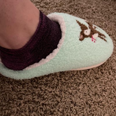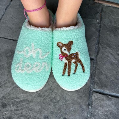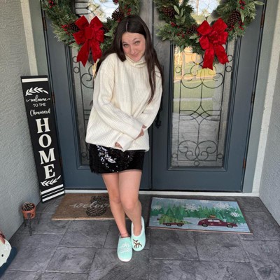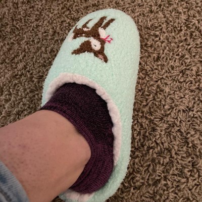 [This review was collected as part of a promotion.] These slippers are easy to slip on and definitely keep your feet warm. The turquoise color is very pretty and absolutely love the deer with the pink ribbon around its neck. The slippers are perfect for the holiday season. My teenager is wearing size medium and it fits expected. She typically wears a street size 7.5 shoe. She wears these in the evenings around the house or before having to put on dress shoes to go out.