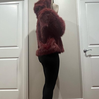 [This review was collected as part of a promotion.] This is a gorgeous burgundy colored faux fur coat that looks gorgeous on It fastens with clasps and is easy to slip on. It looks very glamorous and it is perfect for over a party dress or more casual wear with jeans. The fur is full and very tactile. I love the styling and it is right on trend. I am wearing the size Medium and it fits me perfectly. I normally wear a size 8.
