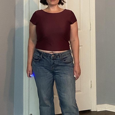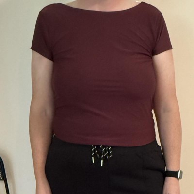 [This review was collected as part of a promotion.] I love this wild fable shirt. I find the design of the low back, very appealing. The color is a deep burgundy and the material is a spandex type material. It is a bit silky, so rides up sometimes, resulting in me having to readjust it. I wear a size medium and it fits me perfectly. It’s perfect to wear with a high waisted skirt, shorts or athletic wear making it very versatile. I received an incentive to write this review.