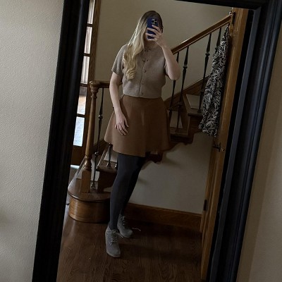 Cozy cute short sleeved sweater. Material is soft and thick. True to size, I got a M which I wear for most Target brand clothes. I paired it with Target sweater skirt for a cozy fall look.