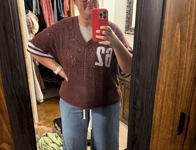 Love the lightness of the knit material. Not too see thru, wear a cami underneath, oversized style