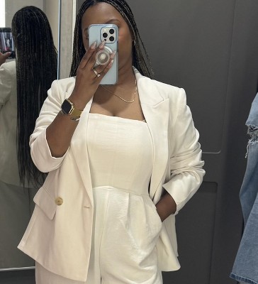 I got influenced into buying this by a fashion stylist on Instagram. She detailed all the reasons it is a good deal and I have to say, I agree. It is fully lined, even the sleeves. It’s vented in the back and has functional pockets such that you can wear with the flaps tucked in or out. It is definitely more of an oversized fit. I am 5’4, 150ish and have a large bust. I got a medium and it fits well. The matching skirt hasn’t arrived yet but this one is a keeper.