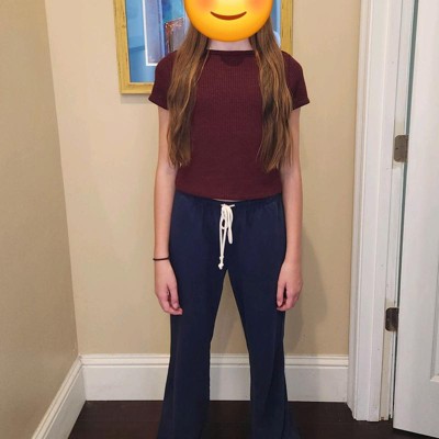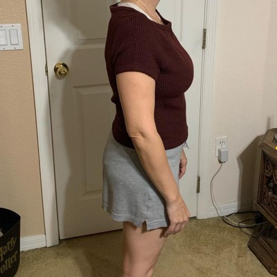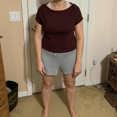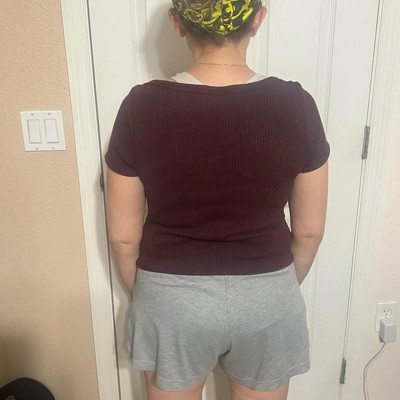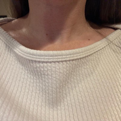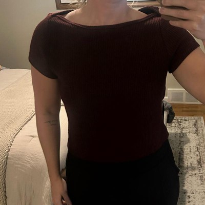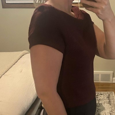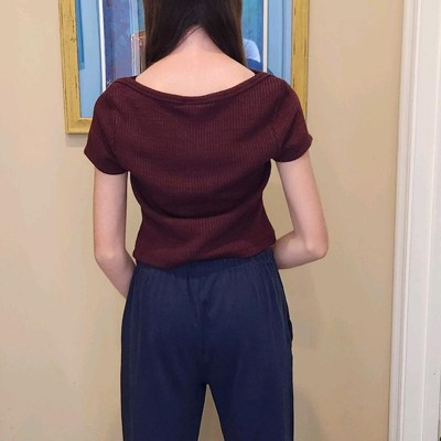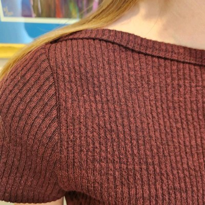 [This review was collected as part of a promotion.] This Universal Thread Women's Slim Fit Boat Neck Ribbed T-shirt in Burgundy is soooo soft! We bought a Small, so that it will fit my daughter longer and pass school dress code. She would normally wear an XS (she's 5'3", around 100 lbs), so this definitely fits true to size. I love the tiny cable knit design and the fact that the color is a dark heathered burgundy. This feels like it will wash well, and I really like that the knit has a little bit of stretch to it. I'd love to see this in more colors for the spring.