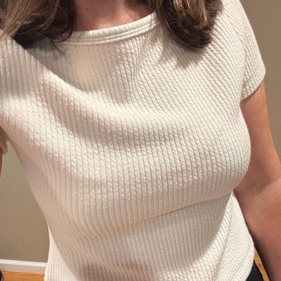 [This review was collected as part of a promotion.] I am five feet tall, have a bra size of 34 DD, and tried on the size medium in this shirt sleeved boatneck ribbed tee shirt from Universal Thread. It fits me very well- I would definitely say it fits true to size. It is comfortable and I really like the neckline. I absolutely love the color, and think it is a very versatile shirt that could go with many different bottoms. Nice buy!