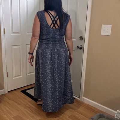 Shopping, commuting, or brunching will be a breeze with this Smocked Midi A-Line Dress from Universal Thread™. This sleeveless dress is made of 100% cotton for all-day comfort and features a smocked bodice that helps find the right fit. Designed in a pullover style, this midi dress features a crew neckline with a scoop back for a breezy feel. Club it with your choice of accessories for a cool, comfy look.