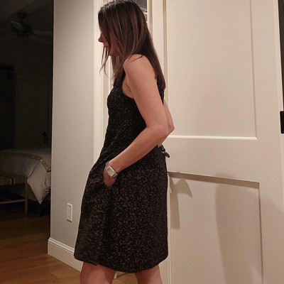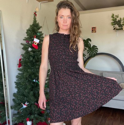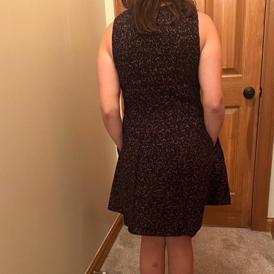 [This review was collected as part of a promotion.] I purchased this women's dress online for myself. This cute little a-line dress has a high neck with a smocked bodice. It has kind of a dropped waist which i like, and pockets, which i LOVE! The red floral pattern is very subtle and pretty against the black background. The length is mini but it isn't too short at all. The one complaint I have about this dress is the difficile had in getting it on and off. I can't just slip it on over my head. I have to unbutton several of the buttons in order to do so. And the buttons are so tiny and kind of hard to unbutton and button back up. It was kind of a pain. The dress was a little on the pricey side too in my opinion. Cute dress, but could have been more affordable. I am wearing a size small and it fits true to size. I typically wear a size 2-4 in tops and dresses. I am 5'4" and about 120 lbs for reference.