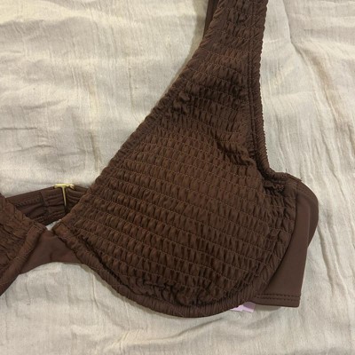 [This review was collected as part of a promotion.] I ordered this bikini top for myself. I am 5’7” 170lbs and my true size is large. I ordered my true size large and it fit true to size. I am in love with this top. The brown color is SO GOOD! The smocked detailing is a great subtle touch to give this top some texture. I love the cut l of this top as well, it’s different. The underwire isn’t my favorite, but I can look past it. Super cute!