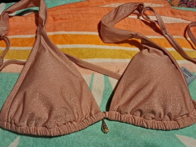Love the sparkle on this pink triangle bikini top. The little shell charm adds a little spice to the top in addition to the sparkle pattern. Great for small chest or you can remove the pads as well. Cute to mix and match with bottoms to match or change it up with a pattern.