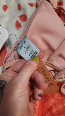 Add a stylish shimmer to your vacay wardrobe with this Lurex Shell Charm Triangle Bikini Top from Shade & Shore™. The pale pink swim top is made from soft, stretchy fabric with full lining for comfortable wear in and out of the water, along with metallic fibers for a sparkling touch to your beachwear. It features a triangle-cup silhouette accented with a gold-tone shell charm dangling at the center front. Plus, it comes complete with adjustable shoulder straps and a back-tie strap for a customizable, stay-put fit.
