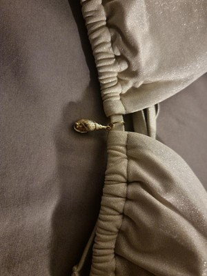 Comfortable, cute design! The shell charm is an adorable addition to the front middle of this bikini top. The bikini straps are adjustable, and with the straps to tie in the back, you can easily adjust width as well. The material has a nice golden shimmer.