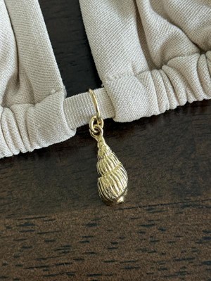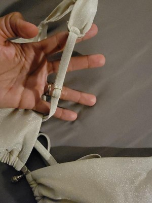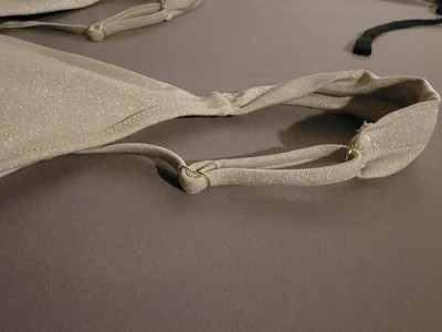 Comfortable, cute design! The shell charm is an adorable addition to the front middle of this bikini top. The bikini straps are adjustable, and with the straps to tie in the back, you can easily adjust width as well. The material has a nice golden shimmer.