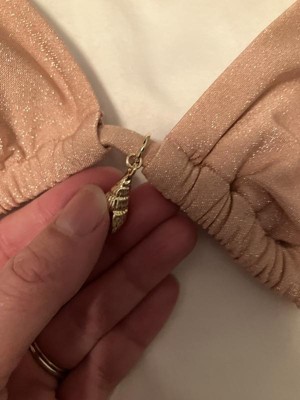 This top is so adorable with the matching bottoms! I got so many compliments on this swimsuit! I love that the top is over the shoulder and ties at the back. It's the perfect mix of a bikini and bralette top. The golden shell on the front is so cute, especially with the matching shell charms on the bottoms. I love that this top is practical but fun. My only complaint would be that the material is a little scratchy due to the shiny yarns, but not scratchy enough to deter me from wearing this suit all Summer. If you're thinking about getting this top, do it!!