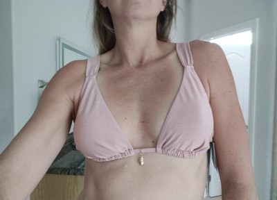 This bikini top is comfortable and fit me true to size. I love the soft pink with shimmer fabric. The padding is enough so it’s not see through and rounds the breasts. It’s got some stretch to it but feels secure when on.