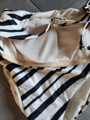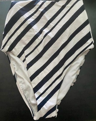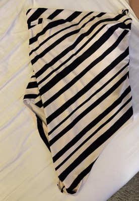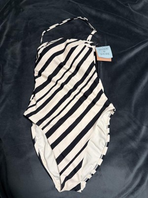 Enjoy your time at the beach or pool in cool style with this Striped Bandeau High-Leg One-Piece Swimsuit from Shade & Shore™. Tailored in a high-leg design, the bandeau one-piece swimsuit features a striped pattern and open detailing at the back to elevate the sunny look. It's made of nylon-spandex blend tricot fabric with full lining to give you the right flexibility and comfort for sunbathing, swimming and beyond. The back hook closure provides a snug fit, and removable cups offer customizable coverage.