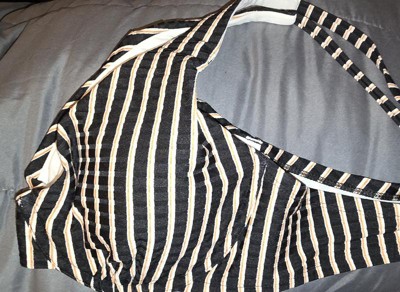 This striped bikiki top is stylish summer staple. It fits great, with underwire for a secure fit. The color is fashionable, no shrinking or fading upon washing. The padding is nice and removable. The straps are adjustable and can be worn criss crossed, or straight up and down. Great coverage, stylish, and comfortable.