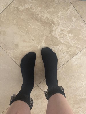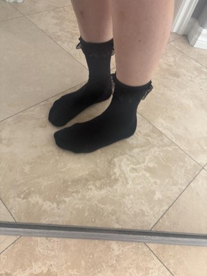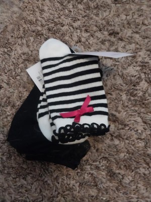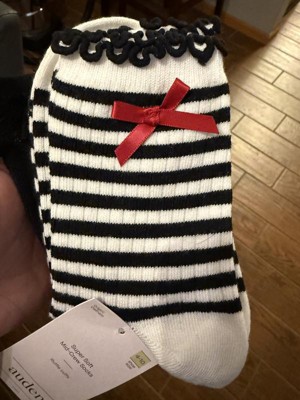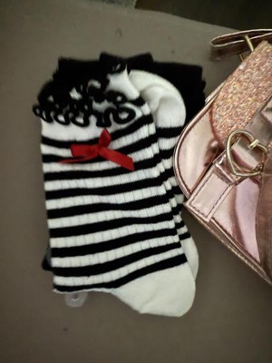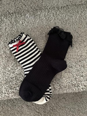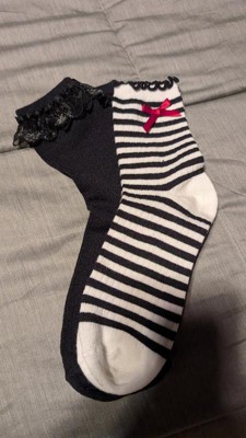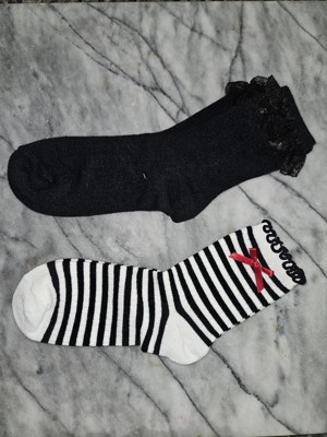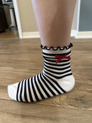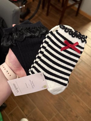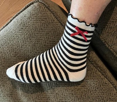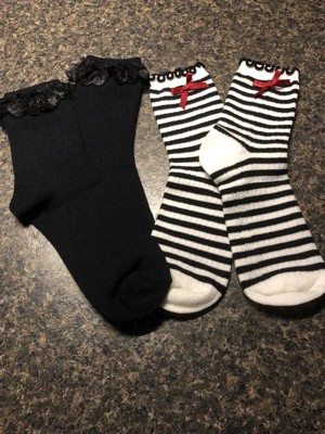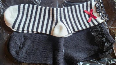 My daughter loves these socks! These socks are so soft and comfortable and slide on the feet easily. The striped socks have a small bow on the side and the tops of the black sock are lace which is very feminine. These socks are well made and wash well. I definitely would purchase more from this line of socks.
