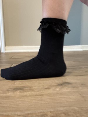 This pack of 2 woken socks are cute. The 1st is black stripes with a red bow on 1 side. Be sure to wear it so the red bow shows since the bow is only on 1 side. The other pair is black with ruffles on top-reminds me of toddler socks. Both pairs are soft and thin. I feel like the solid black pair is a little tighter on top and may stay up high longer. I am a 8 US women size and they fit great.