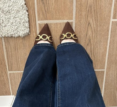 Gorgeous and stylish shoes. The brown is deeper than photo and is a perfect on trend color. The gold detail elevates the look and looks so expensive.