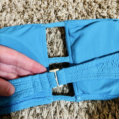 I am very surprised on how flattering this Women's Jacquard Center Front Keyhole Bandeau Bikini Top by Wild Fable is. The color is a vibrant bright Blue Turquoise. The top comes with optional straps that can be added or removed. The top is lined with removable pads. The clasps are a gold color and complement the blue. I wear a size medium and the top squeezes enough so it won’t feel like it’s going to fall off. If you are not use to cleavage this top definitely shows some. Overall it’s super cute.