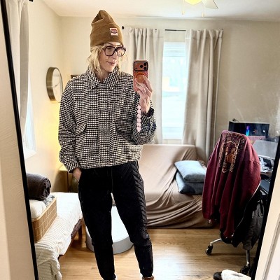 Complete your going-out look with this Textured Houndstooth Jacket from A New Day™. Made from heavyweight woven recycled polyester fabric for comfortable wear, this long-sleeve jacket features a textured houndstooth pattern for a cool look. It has a collared neckline with a front full-length zipper closure and snaps for ease of wear, while flap pockets add space for stashing small items.