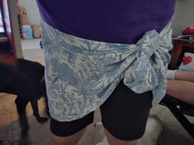 Loving the toile pattern in pretty good pale blue. It’s understated and perfect for summer topping a swimsuit. The sarong style is cute and sizing seems to be true to size. Easy to tie at waist and washes well.