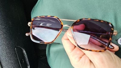 Accentuate your on-the go looks with chic style wearing these Tortoise Shell Print Plastic Aviator Sunglasses from Universal Thread™. These aviator sunglasses feature a tortoise shell print frame with gold-tone metal temples, making for a stunning addition to your accessory collection. The blue lenses offer UV protection for your eyes, while the hinged temples allow for easy folding and convenient storage. Complete with nose pads for comfortable wear, these shatter-resistant, metal-frame sunglasses complement both casual and dressier outfits.