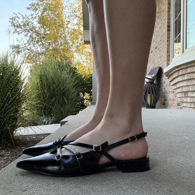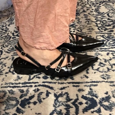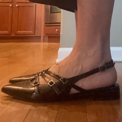 Add a touch of sophisticated charm to your outfit with these Twiggy Multi Buckle Mini Heel Flats from A New Day™. These twiggy flats feature multiple straps on the vamp with buckle closure that helps provide a snug fit and accentuate your feet. The one-inch block heel elevates the look, while the cushioned insole offers better arch support for extra comfort. Designed with a closed pointed toe for a polished appearance, these medium-width flats offers easy transition from casual brunches to fancy dinners.