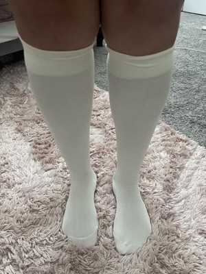 I love wearing these knee-high socks. The material is smooth, soft and the perfect amount of thickness to wear them all year. When on, they go to just below my knees. I love that the colors are black and white, which are perfect neutral colors.