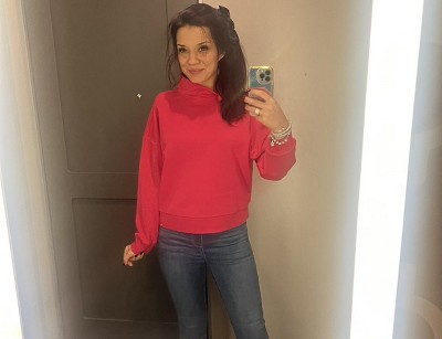 love love love this mock neck! However, this is definately more of a hot pink than a true red. Still very cute! I sized up to an XL for an oversized fit.