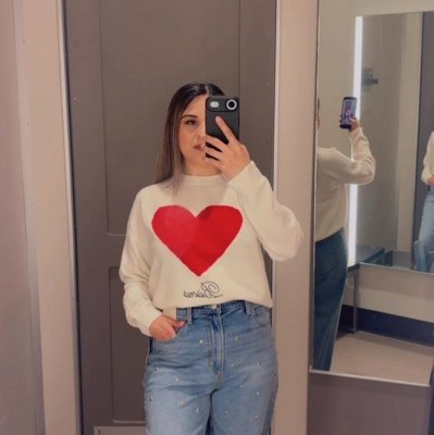 Fun sweater! I went with the red stripes but the cream sweater is also cute in person. I wear a XS or S and the XS was spacious on me. It's also super soft.