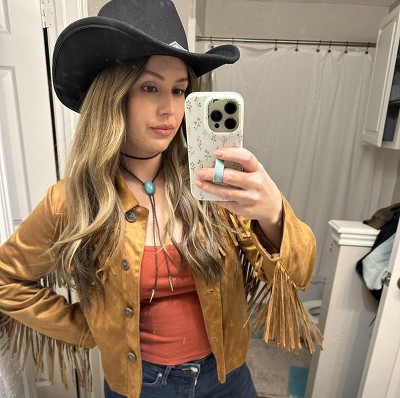 This Western Fringe Faux-Suede Fashion Jacket from Universal Thread™ is a building block for standout outerwear. Crafted from midweight 100% recycled polyester, this brown faux-suede jacket offers a soft, luxurious feel and effortless drape. It features a full button-down front, collared neckline and long sleeves for a classic touch, while fringes on the front, back and sleeves add dynamic movement and playful Western-inspired style. Plus, the regular-fit, mid-length silhouette ensures easy layering over your favorite casual or occasion outfits.