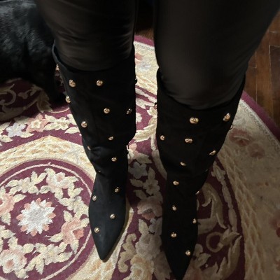 Step into standout style with these Justice Boots with Memory Foam Insole from A New Day™. These mid-calf boots have a jet black upper dotted with gold-tone studs to add a hint of shine to your steps. Set on a memory foam cushioned insole and TPR outsole, these medium-width boots with a closed almond toe have a 2.25-inch-high cone heel for a statement lift to your height, and a side zipper closure for easy on and off.