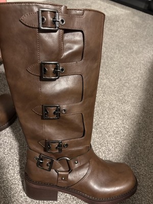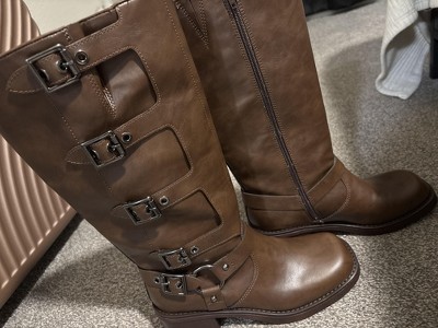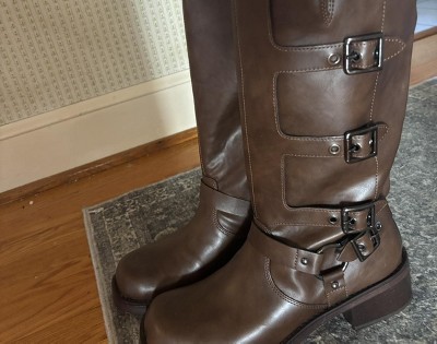 Rebel boots from Wild Fable™ made of dark brown faux leather with a 1.75-inch block heel and 12-inch shaft height. Designed with buckle accents down one side and a zipper closure on the other side. Set on a 100% TPR outsole with a memory foam insole for all-day comfortable wear.