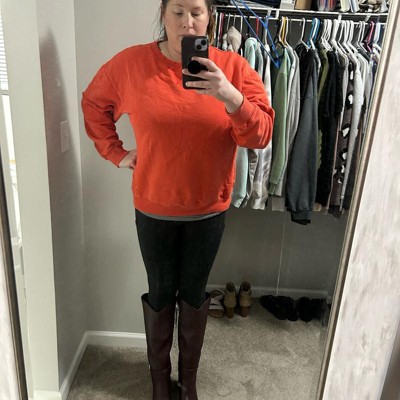 [This review was collected as part of a promotion.] I love knee high boots and was so excited to try these! The boots have a higher heel than i expected but truly feel comfortable when I wear them. I typically wear a 7 1/2 but went up to an 8 because I like to wear thick socks with my boots. The boots hit right below my knee and look great over jeans. I tried them under mine flared jeans but feel like they look bulky like that. I think wearing them with leggings would be super cute too. This item Felt true to size and the width Felt true to width.