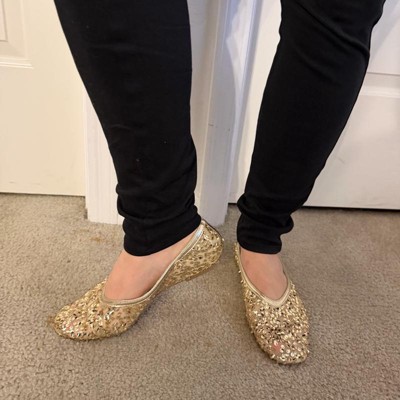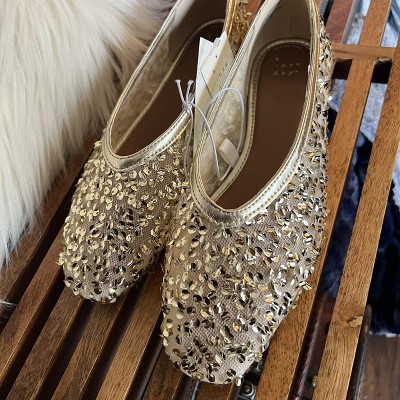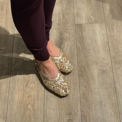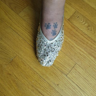 [This review was collected as part of a promotion.] I have wider feet and these fit fabulously. They were stretchy and easy to slip on. Because of the pointed toe, there was a little space where my front toes would meet the tip of the Shoe the one thing I didn’t like about this gap was that the material on the shoe was see-through so you could see my toes. The gold sequins Are beautiful and are perfect for a holiday outfit.