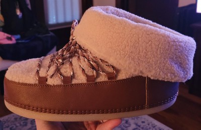 [This review was collected as part of a promotion.] I wear 7-7.5 and got 8 because these looked thick. Biggo casing is what it feels like. They aren’t as soft as they look. Not flexible at all, maybe should have expected. That shearling look really doesn’t track inside— cheap cushioning. Not really worth it imo. Better off getting preowned in similar range.
