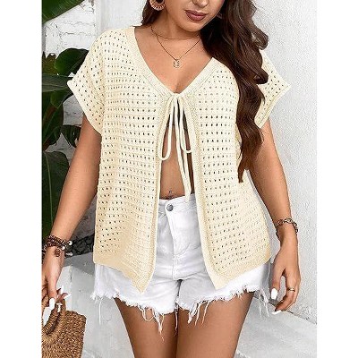 Women Crochet Cardigan Shrug Lightweight Thin Short Sleeve Casual Open Front Cardigan