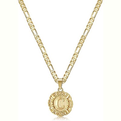 Women's 14K Gold Plated Initial Necklace with Round Letter Pendant from A-Z on Figaro Chain
