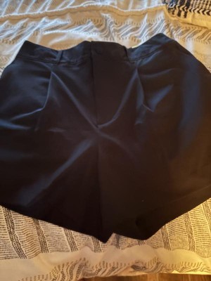 These shorts have a good fit and look flattering. The material is slightly stretchy. I like the front pleats and length. It also had several pockets, including one that zips, thankfully! One of my favorites.