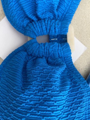 This bandeau swim top is cute. It is a pretty blue color and the ribbed material adds a nice texture to what is usually just smooth. It has a white plastic piece between the two bra parts that also adds a different look. It fits nicely and is well made.
