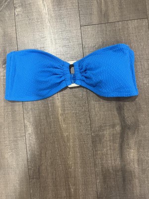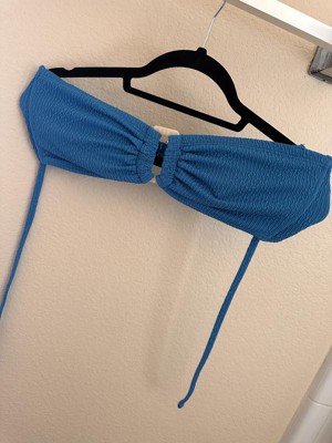 Bright blue strapless bikini top with buckle look detail!
